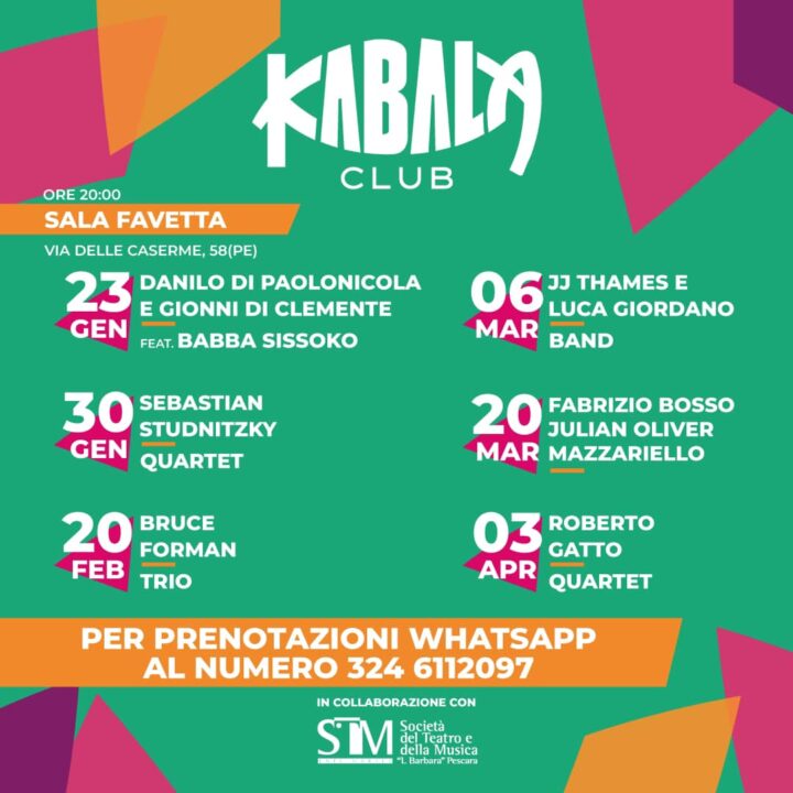 The 2025 season of the Kabala Club in Pescara opened with a new programme dedicated to the beauty and complexity of jazz. A musical journey that intertwines tradition and innovation, hosting nationally and internationally renowned artists from January to March, such as Danilo Di Paolonicola, Sebastian Studnitzky, Bruce Foreman and JJ Thames.